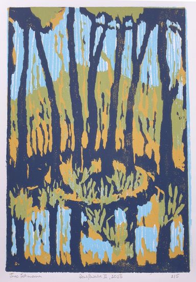 Holzschnitt Landschaft am Fluss